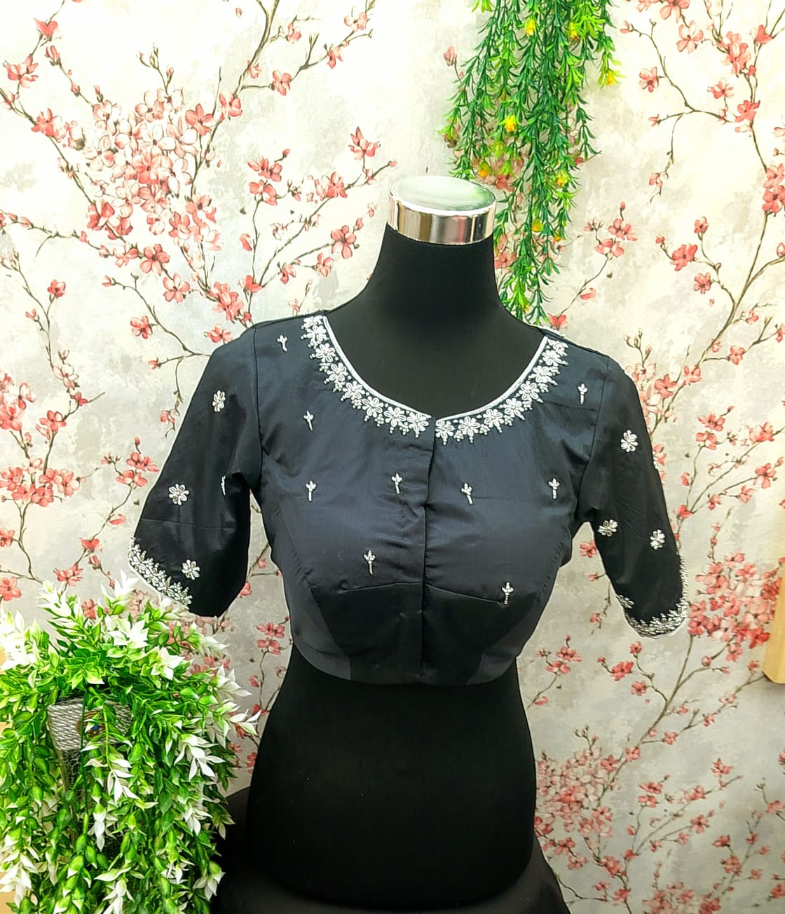 Exquisite black fabric adorned with intricate silver embroidery, creating a luxurious contrast that elevates any ensemble. The...
