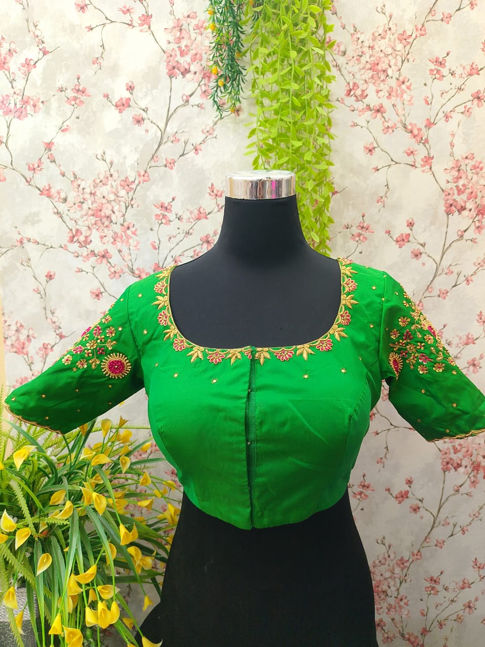 Parrot Green with net behind and golden and pink Embroidery blouse