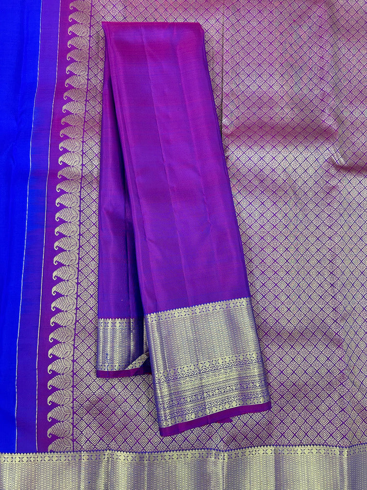 This Cobalt Blue Kanjivaram Saree features a rich purple border, blending vibrant blue tones with elegant purple...