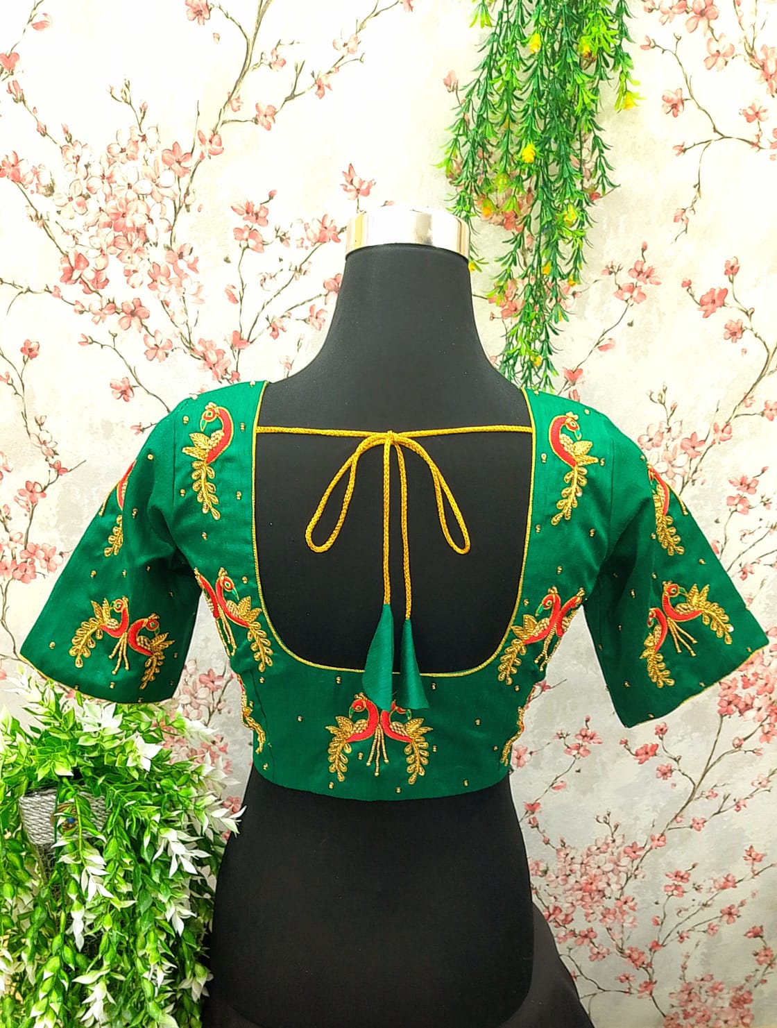 Embrace your natural elegance with our Dark Forest green blouse adorned with stunning peacock embroidery. The...