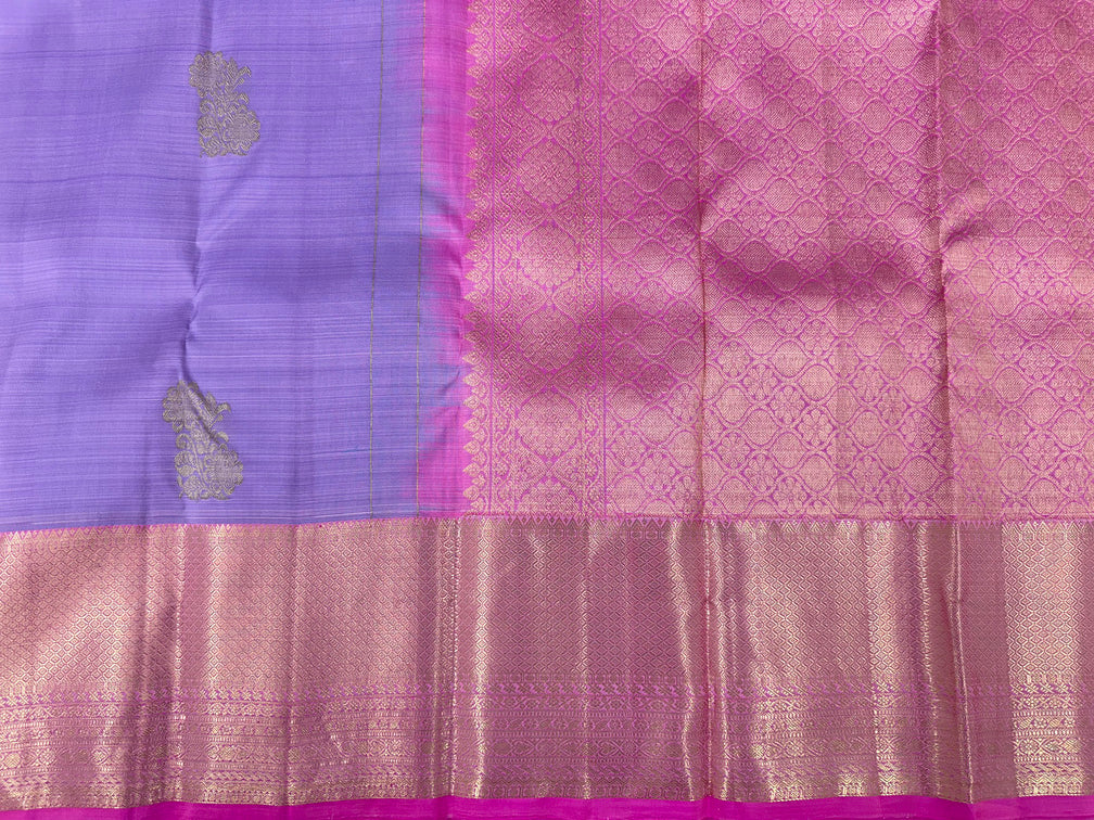 This Lavender Kanjivaram Saree is beautifully accented with a carnation pink border, blending gentle pastel shades with...